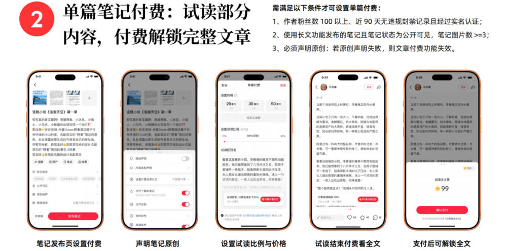 第二类是输出深度干货、行业洞察的长文作者,提供“单篇笔记付费阅读”功能——创作者可针对长文设置免费试读比例,读者支付单笔费用即可解锁全文。