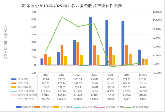 进入2023年,歌尔智能硬件业务的营收开始出现了明显下滑,由上一年的同比增长92.27%,变为下跌6.93%,随后2024年下跌2.57%,至2025年上半年,仅保持2.49%微弱增长。